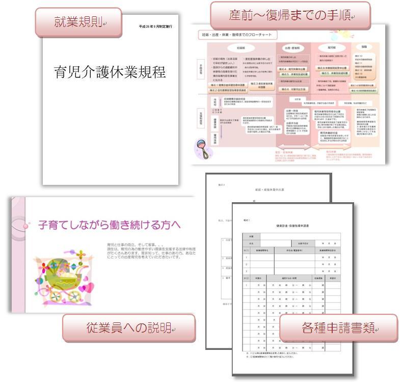 両立支援の為の説明会を開始しました。その他就業規則、各種申請書、従業員の方への説明等につきましてもご相談ください。